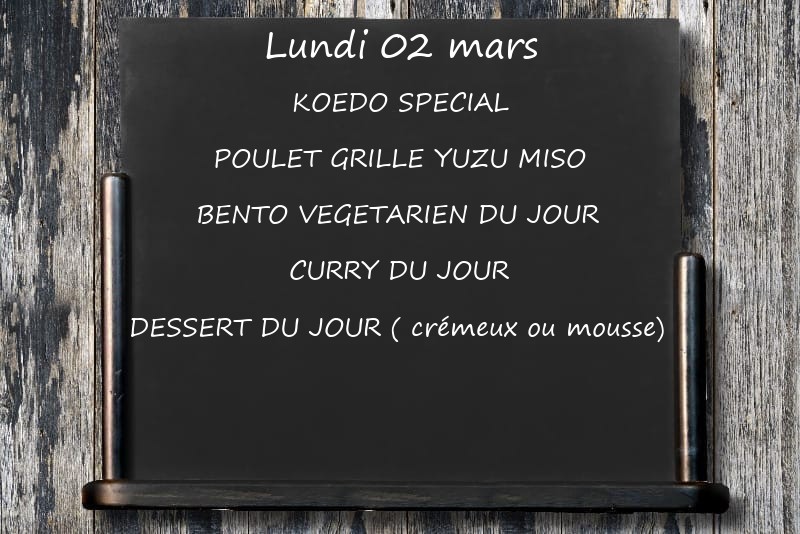 KOEDO SPECIALPOULET GRILLE YUZU MISOBENTO VEGETARIEN DU JOUR CURRY DU JOURDESSERT DU JOUR ( crémeux ou mousse)