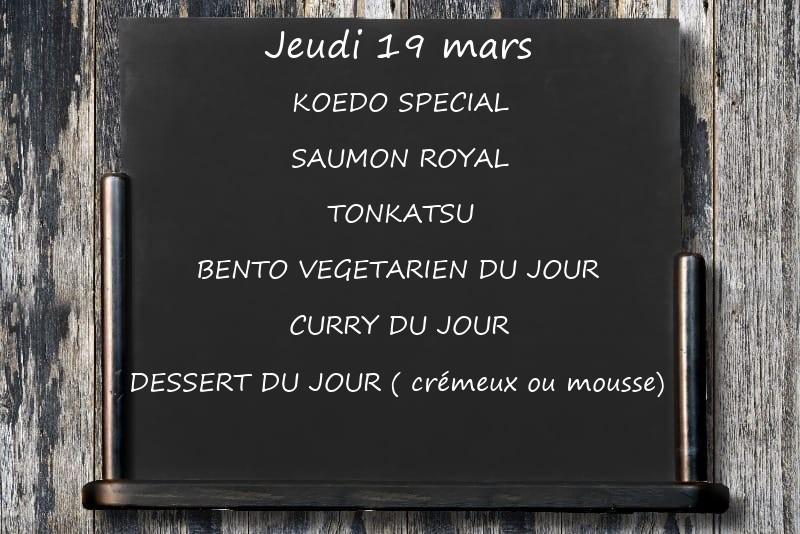 KOEDO SPECIALSAUMON ROYALTONKATSUBENTO VEGETARIEN DU JOUR CURRY DU JOURDESSERT DU JOUR ( crémeux ou mousse)