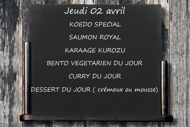 KOEDO SPECIALSAUMON ROYALKARAAGE KUROZUBENTO VEGETARIEN DU JOUR CURRY DU JOURDESSERT DU JOUR ( crémeux ou mousse)