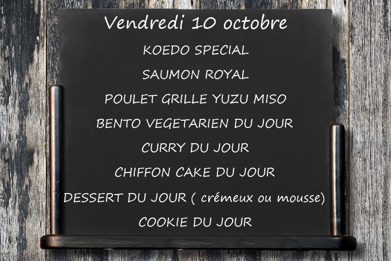 KOEDO SPECIALSAUMON ROYALPOULET GRILLE YUZU MISOBENTO VEGETARIEN DU JOUR CURRY DU JOURCHIFFON CAKE DU JOURDESSERT DU JOUR ( crémeux ou mousse)COOKIE DU JOUR