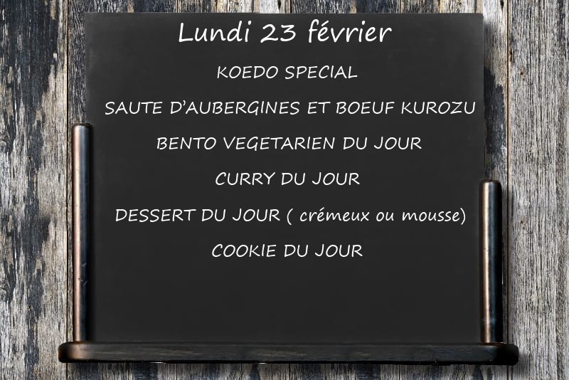 KOEDO SPECIALSAUTE D’AUBERGINES ET BOEUF KUROZUBENTO VEGETARIEN DU JOUR CURRY DU JOURDESSERT DU JOUR ( crémeux ou mousse)COOKIE DU JOUR