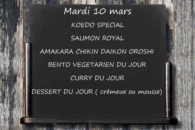 KOEDO SPECIALSAUMON ROYALAMAKARA CHIKIN DAIKON OROSHIBENTO VEGETARIEN DU JOUR CURRY DU JOURDESSERT DU JOUR ( crémeux ou mousse)